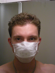 I was sick over my birthday in November. Sick enough to go to a doctor, in fact. Ms. Semba gave me a mask to wear while I slept, with a neat semi-medicated insert. The insert was impregnated with a weakly mediciney-smelling liquid, designed to help keep your nasal passages from getting irritated. Here, for your amusement, I present the picture I took in my bathroom mirror. If you look closely, you can see the holes cut in the insert to allow the wearer to breathe easier.