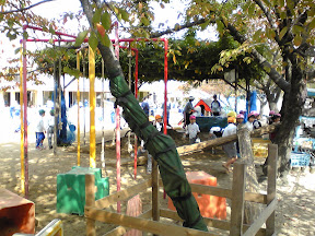 We always show up at recess, when the entire student body is free to do whatever they please. They literally have free rein inside the school’s fence, with some kids running around inside the various classrooms gluing milk cartons and cardboard together, but most of the kids outside, doing educational things like using real knives to cut up real vegetables and put in real frying pans on real gas burners (no gas, of course, that wouldn’t be safe). Or jumping on top of a two meter tall jungle gym. Or practicing their unicycle skills (I kid you not).