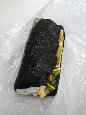 It’s basically a big fat sushi roll with sandwich-like innards (lettuce, chicken, egg, and some fixin’s in this case) that you eat like a burrito.